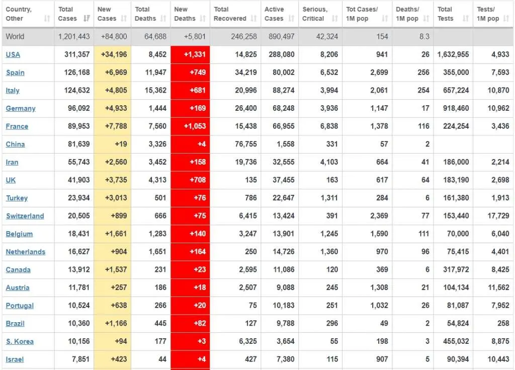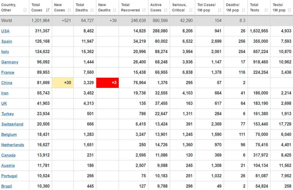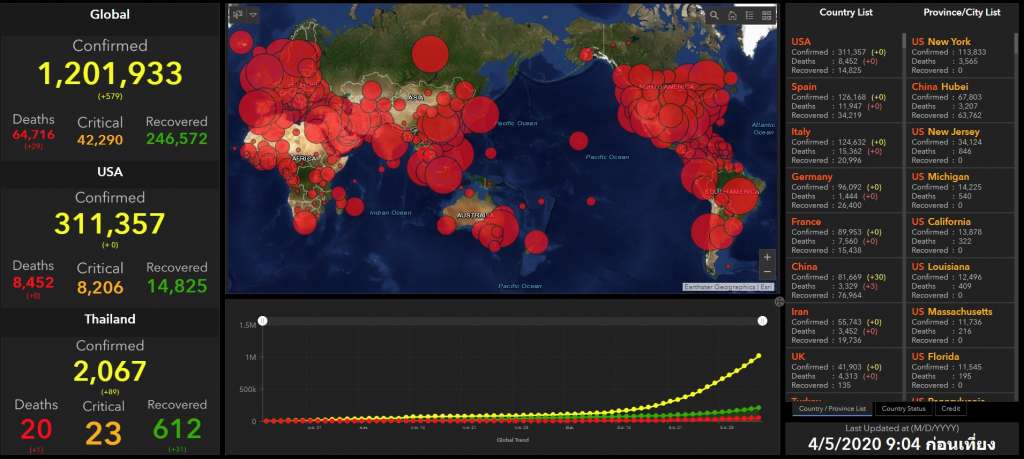 อย่างไรก็ตามยอดสะสมล่าสุด ณ วันที่ 5 เมษายน 2563 เวลา 10.35 น. เปิดเผยว่า มีผู้ป่วยสะสมทั่วโลกอยู่ที่ 1,201,964 ราย มีผู้เสียชีวิต 64,727 คน ในจำนวนนี้มีผู้รักษาหายแล้ว 246,638 ราย