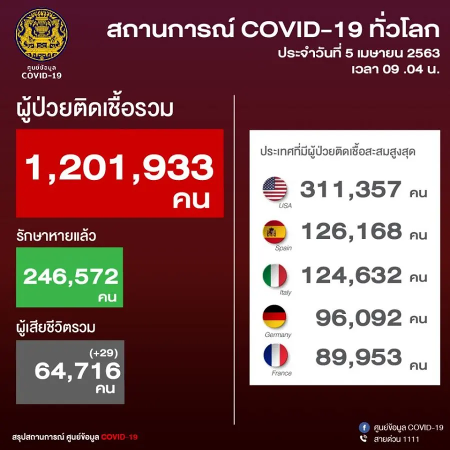 เกี่ยวกับเรื่องนี้ ศูนย์ข้อมูล COVID-19 ได้โพสต์อัพเดตสถานการณ์จากทั่วโลกว่า “สถานการณ์ โรคติดเชื้อไวรัสโคโรนา 2019 (COVID-19) ทั่วโลก ณ วันที่ 5 เมษายน 2563 เวลา 09.04 น.