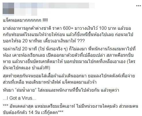 มาส่งอาหารลูกค้าต่างชาติ ราคา 600+ มาวางเงินไว้ 100 บาท แล้วบอกกับฟรอนต์โรงแรมให้จ่ายให้ก่อน แล้วก็ชิ่งหนีขึ้นห้องไปเลย ก่อนจะไปบอกให้รอ 20 นาทีนะ เดี๋ยวเอาเงินมาให้ ???