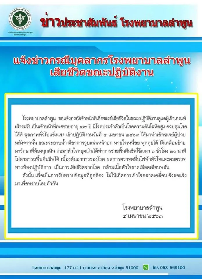 ด้าน โรงพยามาลำพูน แจ้งข่าวกรณีบุคลากรโรงพยาบาลลำพูนเสียชีวิตขณะปฏิบัติงาน โรงพยาบาลลำพูน ขอแจ้งกรณีเจ้าหน้าที่เอ็กชเรย์เสียชีวิตในขณะปฏิบัติงานดูแลผู้เข้าเกณฑ์เฝ้าระวัง เป็นเจ้าหน้าที่เพศชายอายุ ๔๗ ปี มีโรคประจำตัวเป็นโรคความตันโลหิตสูง ควบคุมโรคได้ดี สุขภาพทั่วไปแข็งแรง เข้าปฏิบัติงานวันที่ ๔ เมษายน ๕๖๓ ได้มาทำเอ็กซเรย์ผู้ปวยหลังจากนั้น ขณะจะอาบน้ำ มีอาการวูบแน่นหน้าอก หายใจเหนื่อย พูดคุยได้ ได้เคลื่อนย้ายมารักษาที่ห้องฉุกเฉิน ต่อมาหัวใจหยุดต้นได้ทำการช่วยฟื้นคืนชีพใช้เวลา ๑ ชั่วโมง ๒๐ นาทีไม่สามารถฟื้นคืนชีพได้ เบื้องต้นอาการของโรค ผลการตรวจคลื่นไฟฟ้าหัวใจและผลตรวจทางห้องปฏิบัติการ เป็นการเสียชีวิตจากโรค กล้ามเนื้อหัวใจขาดเลือดเฉียบพลันดังนั้น เพื่อเป็นการรับทราบข้อมูลที่ถูกต้อง ไม่ให้เกิดการเข้าใจคลาดเคลื่อน จึงขอแจ้งมาเพื่อทราบโดยทั่วกัน