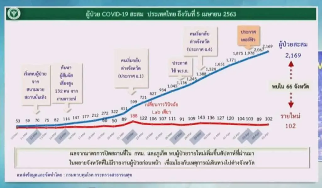 ล่าสุด (05 เมษายน 2563 11.30 น.) ศูนย์บริหารสถานการณ์โควิด19 นายแพทย์ทวีศิลป์ วิษณุโยธิน โฆษกกระทรวงสาธารณสุข และ โฆษกศูนย์บริหารสถานการณ์การแพร่ระบาดของโรคติดเชื้อไวรัสโคโรนา 2019 (โควิด-19) หรือ ศบค. ได้อัพเดตผู้ป่วยล่าสุดว่าพบว่ามีผู้ป่วยรายใหม่จำนวน ติดเชื้อเพิ่ม 102 ราย เป็น 66 จังหวัด ติดเชื้อสะสม 2,169 คน รักษาหาย 674 ราย เสียชีวิตเพิ่ม 3 คน รวยยอดเสียชีวิตที่สะสม 23 คน