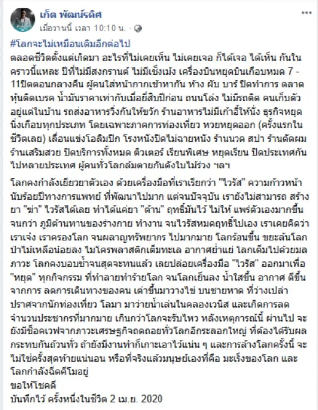 เป็นเรื่องราวของผู้ใช้เฟสบุ๊คชื่อว่า เก็ต พัฒน์รดิศ ซึ่งโพสต์ดังกล่าวเราได้เห็นภาพชัดเจนมาก โดยได้โพสต์ข้อความระบุว่า โลกจะไม่เหมือนเดิมอีกต่อไป ตลอดชีวิตตั้งแต่เกิดมา อะไรที่ไม่เคยเห็น ไม่เคยเจอ ก็ได้เจอ ได้เห็น กันในคราวนี้แหละ ปีที่ไม่มีสงกรานต์ ไม่มีเช็งเม้ง เครื่องบินหยุดบินเกือบหมด 7 11 ปิดตอนกลางคืน ผู้คนใส่หน้ากากเข้าหากัน ห้าง ผับ บาร์ ปิดทำการ ตลาดหุ้นติดเบรค น้ำมันราคาเท่ากับเมื่อยี่สิบปีก่อน ถนนโล่ง ไม่มีรถติด คนเก็บตัวอยู่แต่ในบ้าน รถส่งอาหารวิ่งกันให้ขวัก ร้านอาหารไม่มีเก้าอี้ให้นั่ง ธุรกิจหยุดนิ่งเกือบทุกประเภท โดยเฉพาะภาคการท่องเที่ยว หวยหยุดออก