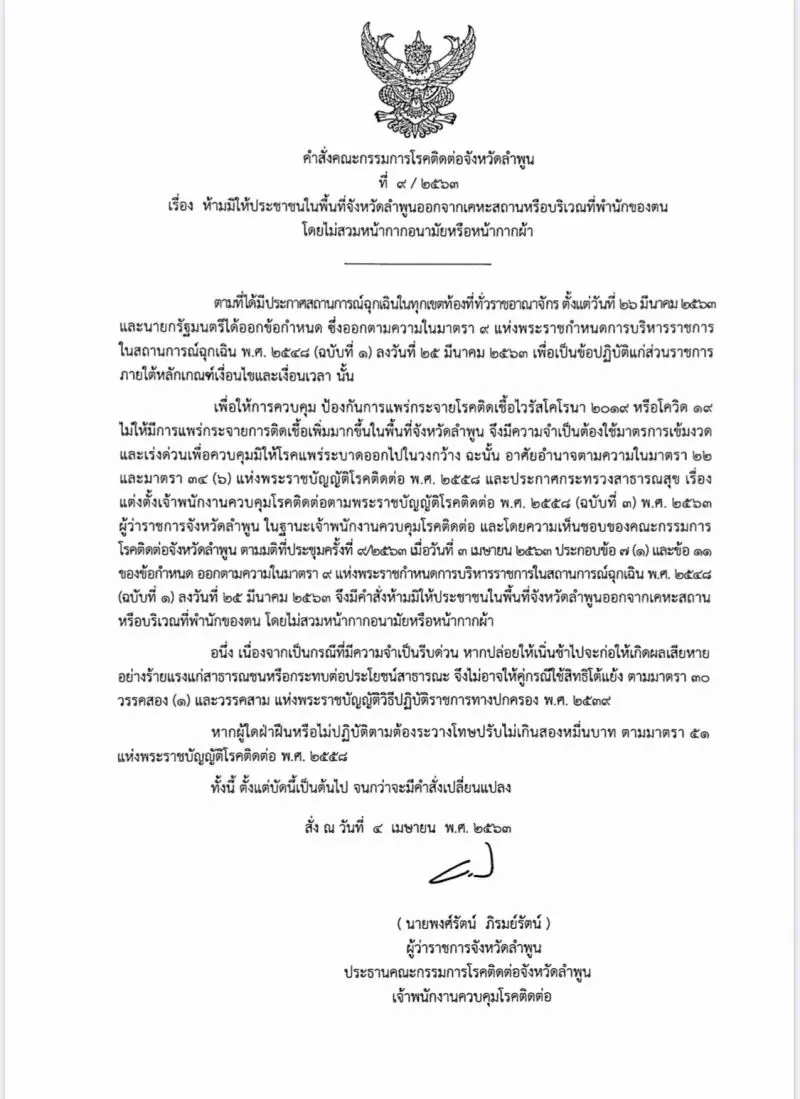 ตามที่ได้มีประกาศสถานการณ์ฉุกเฉินในทุกเขตท้องที่ทั่วตั้งแต่วันที่ ๒๖ มีนาคม ๒๕๖๓ และนายกรัฐมนตรีได้ออกข้อ ซึ่งออกตามความในมาตรา๙ แห่งพระราชกำหนดการบริหารราชการ ในสถานการณ์ฉุกเฉิน พ.ศ. ๒๕๕๔ (ฉบับที่ ๑) ลงวันที่ ๒๕ มีนาคม ๒๕๖๓ เพื่อเป็นข้อปฏิบัติแก่ส่วนราชการ ภายใต้หลักเกณฑ์เงื่อนไขและเงื่อนนั้น เพื่อให้การควบคุมป้องกันการแพร่กระจายโรคติดเชื้อไวรัส๒๐๑๔ หรือโควิด๑๙ ไม่ให้มีการแพร่กระจายการติดเชื้อเพิ่มมากขึ้นใน จึงมีความจำเป็นต้องใช้มาตรการ และเร่งด่วนเพื่อควบคุมมิให้โรคแพร่ระบาดออกไป ฉะนั้น อาศัยอำนาจตามความในมาตรา๒๒ และมาตรา ๓๔ (๖) แห่งพระราชบัญญัติโรคติดต่อ พ.ศ. ๒๕๕๘ และประกาศกระทรวงสาธารณสุขเรื่อง แต่งตั้งเจ้าพนักงานควบคุมโรคติดต่อตามพระราชบัญญัติโรคติดต่อ พ.ศ. ๒๕๕๔ (ฉบับ ๓) พ.ศ. ๒๕๖๓ ผู้ว่าราชการจังหวัดลำพูน ในฐานะเจ้าพนักงานควบคุมโรคติดต่อและโดยความเห็นชอบของคณะกรรมการ โรคติดต่อจังหวัดลำพูน ตามมติที่ประชุม ๔/๒๕๖๓ เมื่อวันที่๓ เมษายน ๒๕๖๓ ประกอบข้อ๗ (๑และข้อ๑) ของข้อกำหนดออกตามความในมาตรา ๙ แห่งพระราชกำหนดการบริหารราชการในสถานการณ์ฉุกเฉินพ.ศ. ๒๕๕๘ (ฉบับ ๑) ลงวันที่๒๕ มีนาคม ๒๕๖๓ จึงมีคำสั่งห้ามมิให้ประชาชนในพื้นที่จังหวัดลำพูน หรือบริเวณที่พำนักโดยไม่สวมหน้ากากอนามัยหรือหน้ากาก อนึ่ง เนื่องจากเป็นกรณีที่มีความจำเป็นหากปล่อยให้เนิ่นช้าไปจะก่อให้เกิด อย่างร้ายแรงแก่สาธารณชนหรือกระทบต่อประโยชน์สาธารณะ จึงไม่อาจให้คู่กรณีใช้สิทธิตามมาตรา ๓๐ วรรคสอง (๓) และวรรคสาม แห่งพระราชบัญญัติวิธีปฏิบัติราชการ พ.ศ. ๒๕๓๙