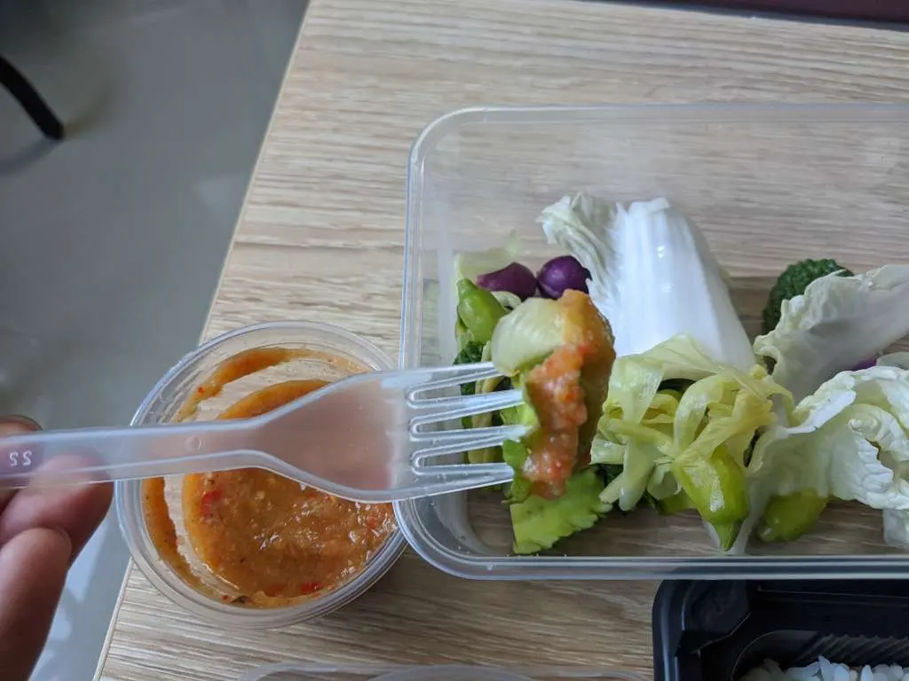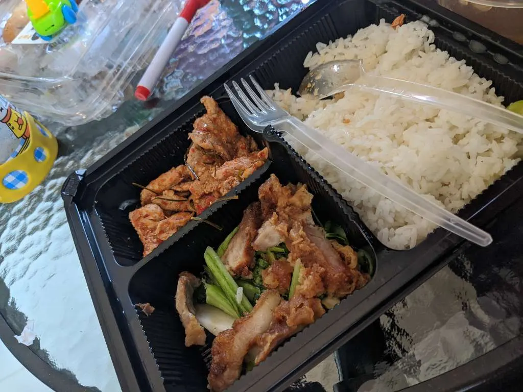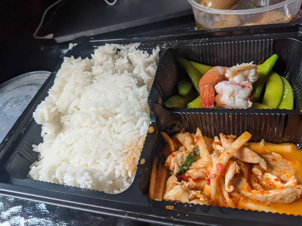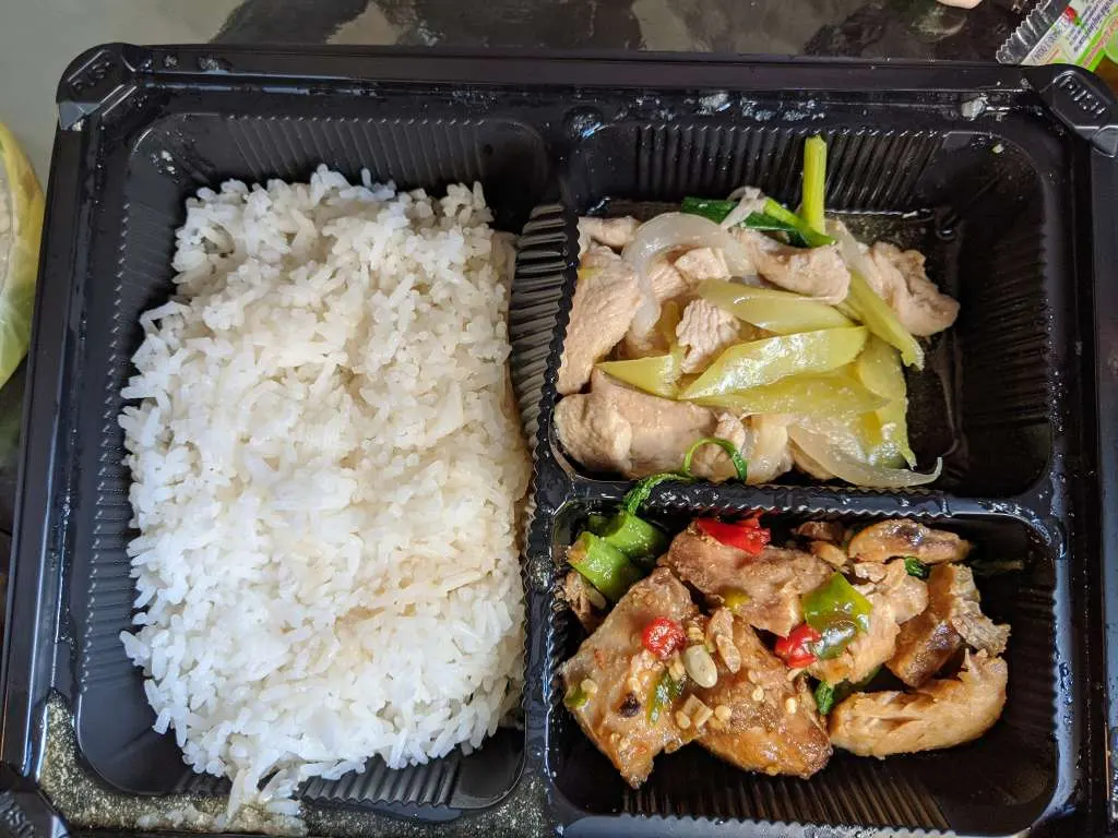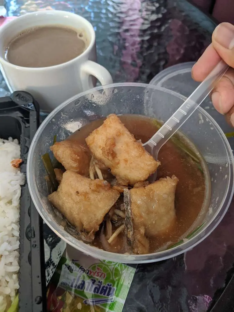 เปิดกล่องมาเจอข้าวสวยร้อนๆ กินกับหมูผัดพริกแกง และค้าน้าผัดหมูกรอบกลับใจ ต้มปลาไว้ซดน้ำ ออกหวานไปนิดแต่ก็ไม่ติดนะฮ้าฟ เนื้อปลาเยอะมาก ตบด้วยกาแฟอุ่นๆ ชื่นจึยบระจ้าวค่ะ