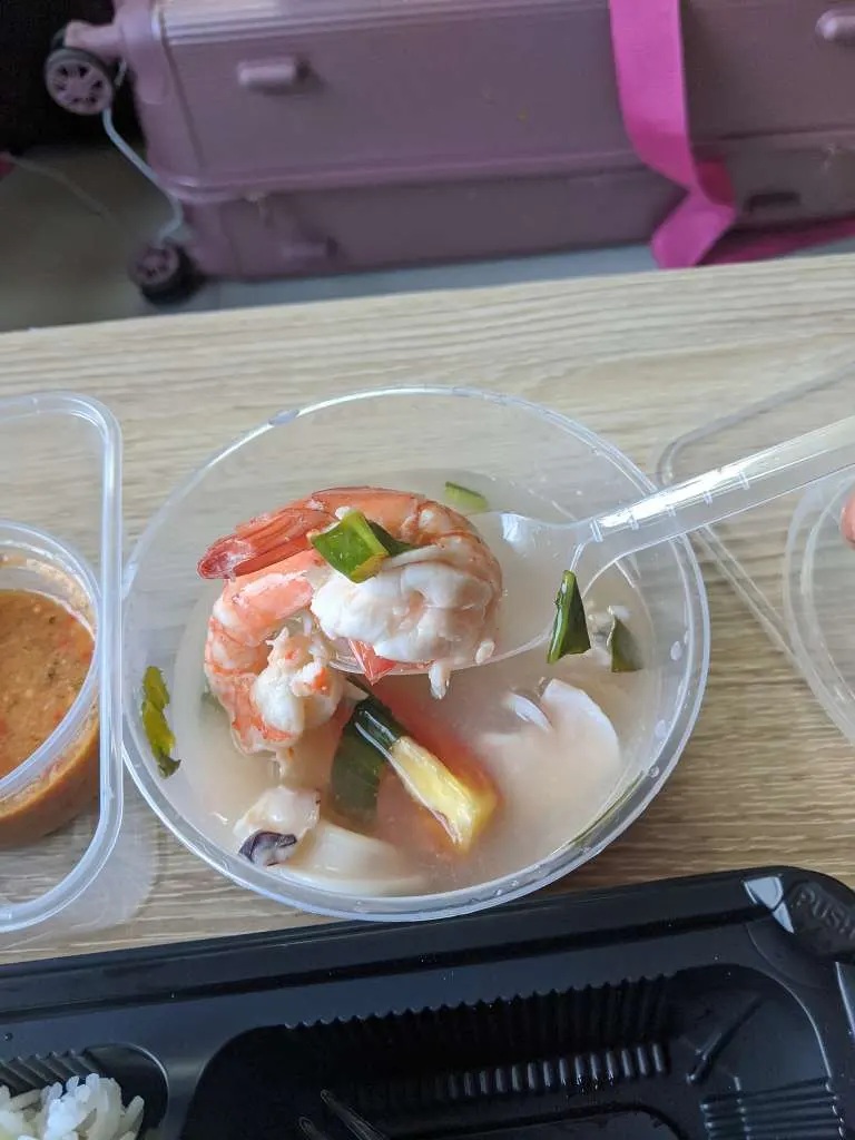 น้ำซุปเข้าไปแอบมีรสชาติกลางๆ ไม่จี๊ดจ๊าดมาก น่าจะทำมาเซฟๆสำหรับทุกคน ตามด้วยกุ้งตัวโตๆสองตัวนี้ บอกเลยว่าอะไรก็ยอม