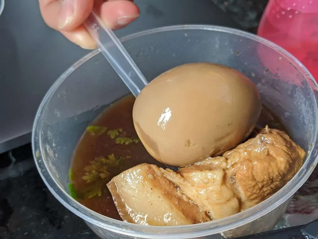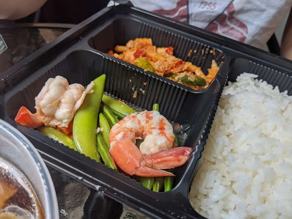 เที่ยงนี้เรามี ไข่พะโล้อวบๆ รสชาติชุ่มฉ่ำ กินกับข้าวสวยร้อนๆ และไก่ผัดหน่อไม้ ท่าไม้ตายคือกุ้งตัวโตๆ ผัดผักน้ำมันหอย อร่อยยกล้อไปเลยครับผมครับโผม