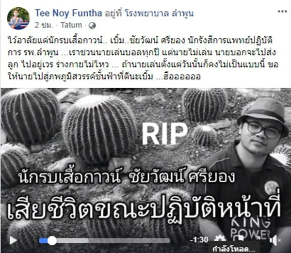 อีกหนึ่งข่าวเศร้าของวงการการแพทยืที่ต้องสูญเสียบุคลากรไปท่ามกลางสถานการณ์วิกฤตไวรัสโควิด-19 โดยในวันนี้มีการรายงานว่า นายชัยวัฒน์ ศรียอง เจ้าหน้าที่แผนกเอกซเรย์ ร.พ.ลำพูน ซึ่งคอยดูแลผู้ป่วยกลุ่มเสี่ยงและผู้ติดเชื้อโควิด-19 ใน จ.ลำพูน เสียชีวิตอย่างกระทันหันท่ามกลางความเสียใจของครอบครัว และเพื่อนร่วมงาน