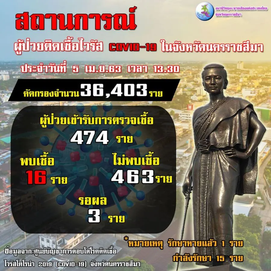ล่าสุดมีผู้ป่วยรักษาหายจากโควิด-19 จำนวน 1 ราย เป็นชายอายุ 38 ปี (เซียนมวย) เดินทางกลับบ้านตั้งแต่วันที่ 4 เมย.แต่ต้องมีการกักตัวอยู่ที่บ้านอีกเป็นเวลา 14 วัน โดยจะมีเจ้าหน้าที่เข้าไปตรวจอาการทุกวัน สรุปในพื้นที่จังหวัดนครราชสีมา มีผู้ป่วยโควิด-19 นอนพักรักษาตัว จำนวน 15 ราย ซึ่งทั้งหมดมีอาการดี