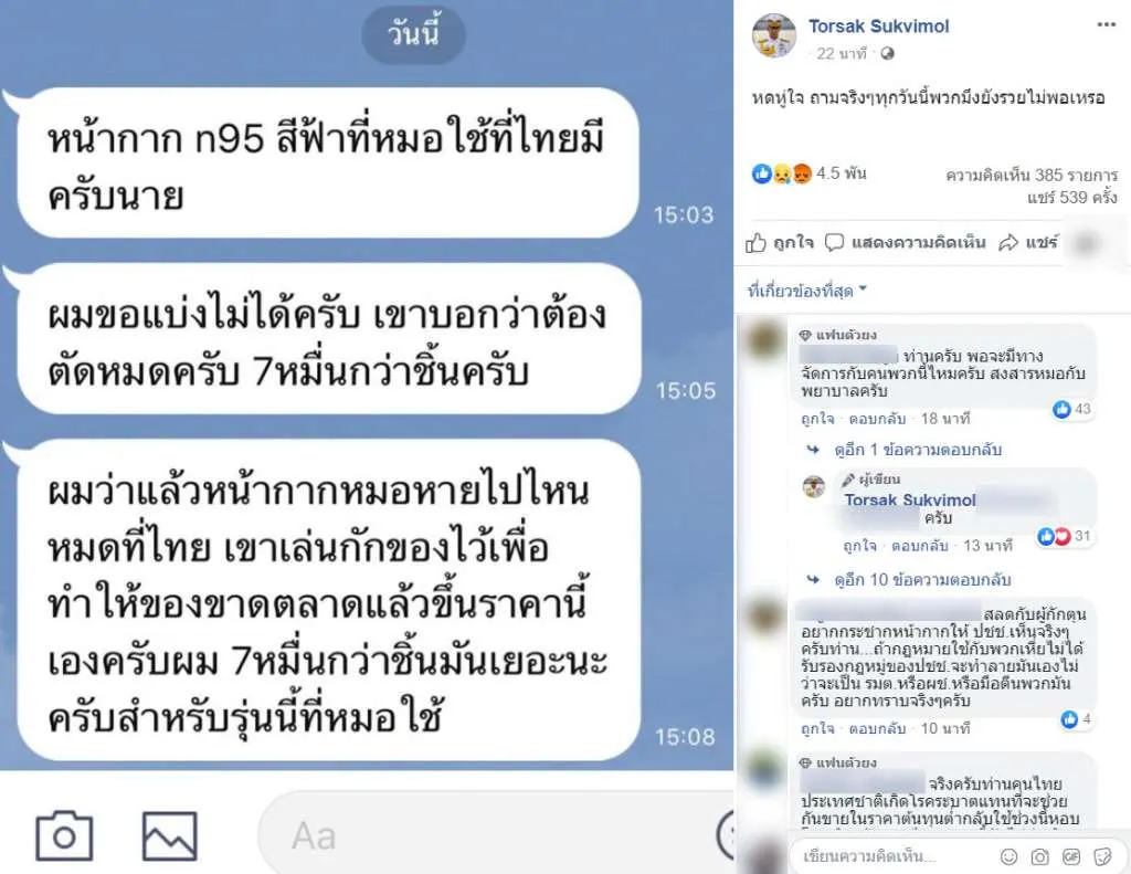 “หน้ากาก N95 สีฟ้าที่หมอใช้ที่ไทยมีครับนาย ผมขอแบ่งไม่ได้ครับ เขาบอกว่าต้อง ตัดหมดครับ 7 หมื่นกว่าชิ้นครับ ผมว่าแล้วหน้ากากหมอหายไปไหน หมดที่ไทย เขาเล่นกักของไว้เพื่อทำให้ของขาดตลาดแล้วขึ้นราคานี่เองครับผม 7 หมื่นกว่าชิ้นมันเยอะนะครับสำหรับรุ่นนี้ที่หมอใช้” ทำให้ชาวเน็ตไม่พอใจและเข้ามาแสดงความคิดเห็นกันเป็นจำนวนมาก