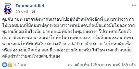 มีคนส่งไลฟ์ที่มีคนไปรวมตัวขับไล่คนต้องสงสัยติดเชื้อออกจากชุมชนมาให้ดู ตอนนี้เจอปัญหาแบบนี้หลายที่เลยนะ คือคนตื่นกลัวแล้วไม่เข้าใจขั้นตอนการกักกันโรคนี้ คือต่อให้เขาติดเชื้อ แต่รัศมีการแพร่กระจาย ประมาณสองเมตร ถ้าเขาอยู่แต่ในบ้าน ไม่ออกมานอกบ้าน คนในชุมชนก็ไม่ต้องกลัวอะไร ถ้าเขาไม่ยอมกักตัวออกมาเพ่นพ่านนี่ก็อีกเรื่อง ฝากพ่อแม่พี่น้องช่วยฟัง จนท ด้วย อย่าฟังข่าวลือแล้วตื่นกลัวจนเกินไป เราไม่สามารถกักเคสต้องสงสัยทุกรายใน รพ ได้นะ เพราะ รพ จะล้นแล้ว ถ้าไม่ให้เขากักตัวในบ้าน แล้วจะให้ไปกักตัวที่ไหน ถ้าให้ตะลอนๆไปหาที่กักตัวใหม่ ถ้าเขาติดเชื้อ ตอนเคลื่อนนย้ายยิ่งเสี่ยงเข้าไปใหญ่ สติครับสติ ถ้าทำอะไรโดยขาดสติ ผลที่จะตามมามันน่ากลัวกว่าเยอะนะ แล้วคุณแน่ใจเหรอ ว่าไอ้ที่ไปชุมนุม มุงกันเยอะๆเพื่อไล่เคสกักกันน่ะ ในกลุ่มคนที่ไปมุง ไม่มีใครติดเชื้อเลยแม้แต่คนเดียว คุณแน่ใจหราาาาาาาาาาา social distancing อ่ะ u knowwwww