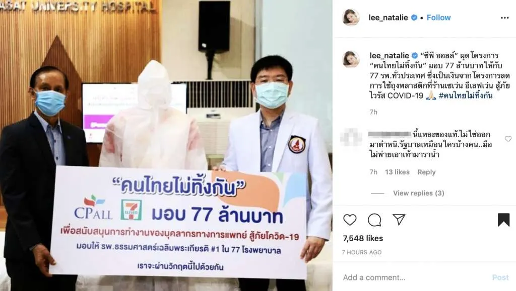 และล่าสุดทางด้าน สาวนาตาลี ก็ได้ออกมาเผยภาพของบริษัท ซีพี ออลล์ จํากัด (มหาชน) ที่ได้ร่วมบริจาคให้กับโรงพยาบาล 77 แห่งทั่วประเทศ จำนวนเงิน 77 ล้านบาท เพื่อต่อสู้กับโรคระบาดโควิด-19 พร้อมระบุข้อความ ซีพี ออลล์ ผุดโครงการ คนไทยไม่ทิ้งกัน มอบ 77 ล้านบาทให้กับ 77 รพ.ทั่วประเทศ ซึ่งเป็นเงินจากโครงการลดการใช้ถุงพลาสติกที่ร้านเซเว่น อีเลฟเว่น สู้ภัยไวรัส COVID-19 คนไทยไม่ทิ้งกัน