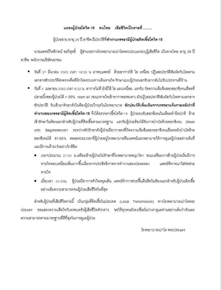 ภายหลังทราบว่าผู้เสียชีวิตชื่อ นายสุรศักดิ์ อาศัยอยู่ตำบลในคลองบางปลากด อำเภอพระสมุทรเจดีย์ จังหวัดสมุทรปราการ ทำงานบริษัทจิลเวลรี่เเห่งหนึ่ง โดยญาติเล่าว่า ก่อนหน้านี้ ผู้เสียชีวิตมีไข้สูงจึงได้ไปหาหมอเพื่อทำการรักษาที่โรงพยาบาลเเห่งหนึ่งย่านอำเภอพระสมุทรเจดีย์ และแพทย์ได้ทำการวินิจฉัยว่า เป็นไข้หวัดใหญ่ ให้ยามาทานที่บ้านและให้พักรักษาตัว 5 วัน โดยที่ผู้เสียชีวิตได้ปิดบังและไม่ได้แจ้งอาการทั้งหมดให้แก่แพทย์ประจำโรงพยาบาลทราบ หลังจากนั้นประมาณ 2 อาทิตย์อาการของผู้เสียชีวิตเริ่มดีขึ้น จึงได้กลับไปทำงานตามปกติ ได้ประมาณ 1 อาทิตย์