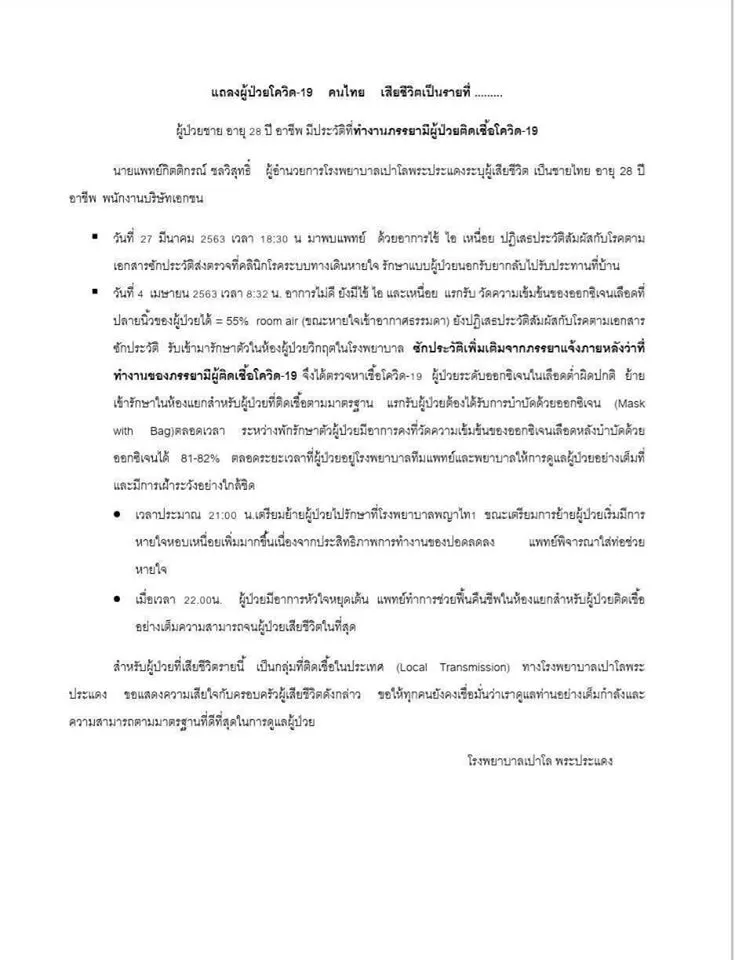 จากกรณีรายงานผู้เสียชีวิตจากการติดเชื้อไวรัสโคโรนา สายพันธุ์ใหม่ 2019 หรือโควิด-19 ซึ่งเป็นชายอายุ 28-29 ปี ที่จังหวัดสมุทรปราการ โดยทางเพจ ข่าวสารเมืองปราการ v2 ได้แจ้งเมื่อวันที่ 5 เมษายน 2563 ว่า