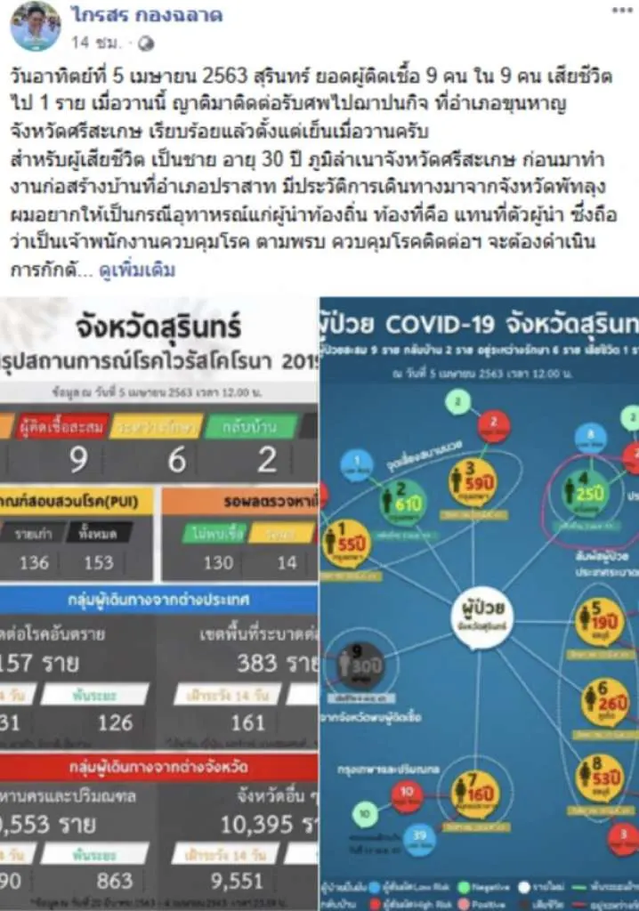 ล่าสุด เฟซบุ๊ก นายไกรสร กองฉลาด ผวจ.สุรินทร์ ได้โพสต์ข้อความและรูปภาพ ข้อมูลสถานการณ์การระบาดของไวรัสโควิด-19 และจำนวนผู้ติดเชื้อ โดยมีข้อความว่า วันอาทิตย์ที่ 5 เมษายน 2563 สุรินทร์ ยอดผู้ติดเชื้อ 9 คน ใน 9 คน เสียชีวิตไป 1 ราย เมื่อวานนี้ ญาติมาติดต่อขอรับศพไปฌาปนกิจ ที่อำเภอขุนหาญ จังหวัดศรีษะเกษ