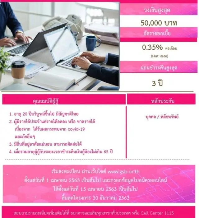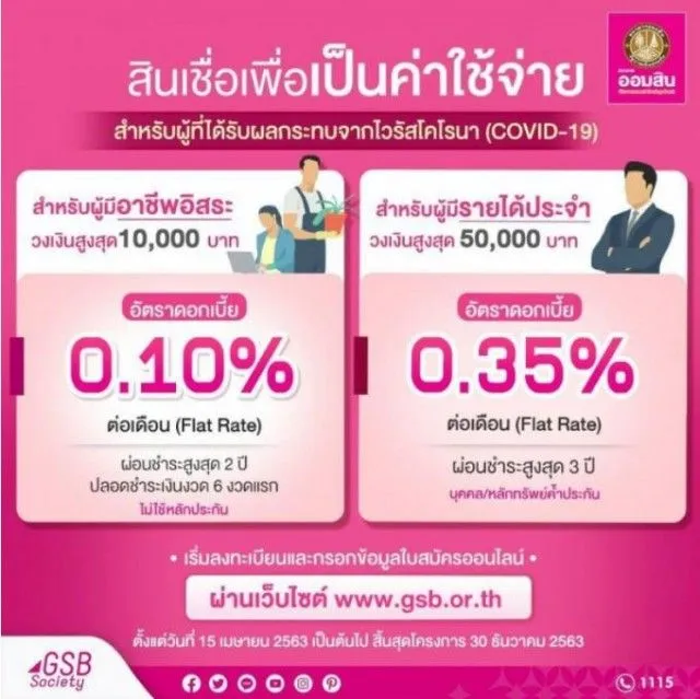 คุณสมบัติ ต้องมีสัญชาติไทย อายุ 20 ปีขึ้นไป มีถิ่นที่อยู่อาศัยแน่นอน และสามารถติดต่อได้ ประกอบอาชีพอิสระที่มีรายได้ ไม่เกินเดือนละ 30000 บาท ผู้ได้รับผลกระทบ จากสถานการณ์ในตอนนี้ เช่น พ่อค้า-แม่ค้าคนขับรถโดยสาร คนขับแท็กซี่,และ มัคคุเทศก์ สินเชื่อสำหรับ ผู้มีรายได้ประจำวงเงินกู้สูงสุด 50000 บาท อัตราดอกเบี้ย 0จุด35 เปอร์เซ็น ต่อเดือน Flat Rate ผ่อนชำระคืนนานถึง 3 ปี ต้องใช้คนค้ำประกัน หรือ สินทรัพย์มาค้ำประกัน คุณสมบัติ สัญชาติไทย อายุ 20 ปีขึ้นไป มีถิ่นที่อยู่อาศัยแน่นอน และสามารถติดต่อได้ เป็นผู้มีรายได้ประจำ แต่รายได้ลดลง หรือข า ดรายได้