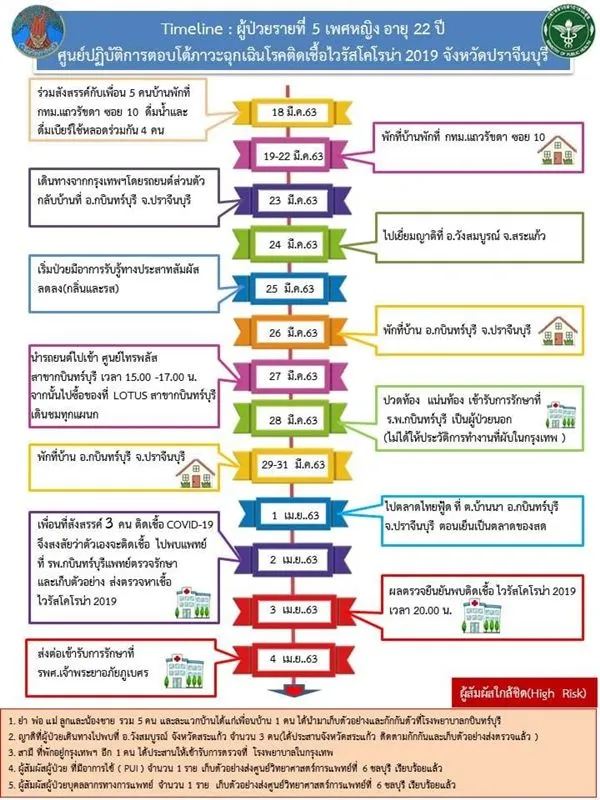 สำหรับไทม์ไลน์ของผู้ป่วยรายที่ 5 เป็นเพศหญิง อายุ 22 ปี ทำงานในผับแห่งหนึ่งที่กรุงเทพฯ โดยเมื่อวันที่ 18 มี.ค.ที่ผ่านมา ได้ร่วมสังสรรค์กับเพื่อน 5 คน ในบ้านพักที่ กทม. ย่านรัชดา ซอย 10 โดยดื่มน้ำและเบียร์ใช้หลอด ร่วมกัน 4 คน ระหว่างวันที่ 19-22 มี.ค. พักที่บ้านพักที่ กทม. ย่านรัชดา ซอย 10