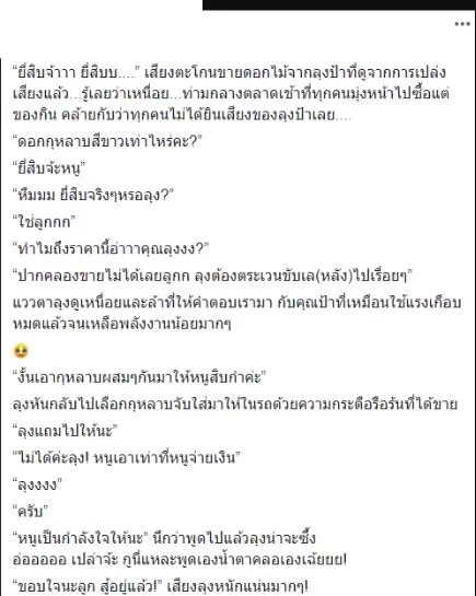 โดยเรื่องราวถูกแชร์จากผู้ใช้เฟชบุ๊กท่านหนึ่ง ซึ่งได้ระบุว่า ยี่สิบจ้าาา ยี่สิบบ เสียงตะโกนขายดอกไม้จากลุงป้าที่ดูจากการเปล่งเสียงแล้ว…รู้เลยว่าเหนื่อย…ท่ามกลางตลาดเช้าที่ทุกคนมุ่งหน้าไปซื้อแต่ของกิน คล้ายกับว่าทุกคนไม่ได้ยินเสียงของลุงป้าเลย