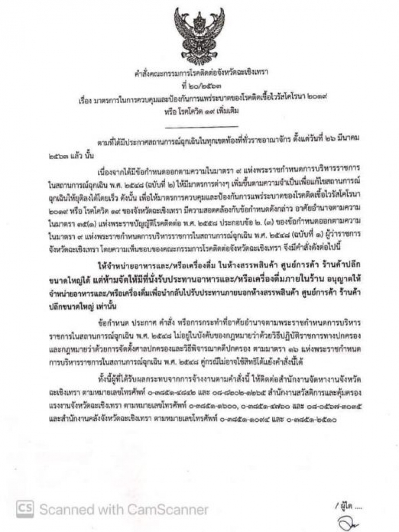 วันที่ 6 เมษายน นายระพี ผ่องบุพกิจ ผวจ.ฉะเชิงเทรา มีคำสั่งดังนี้ ให้จำหน่ายอาหารและเครื่องดื่มในห้างสรรพสินค้า ศูนย์การค้า ร้านค้าปลีกขนาดใหญ่ได้ แต่ห้ามจัดให้มีนั่งรับประทานอาหารภายในร้าน อนุญาตให้จำหน่ายอาหารและเครื่องดื่ม เพื่อนำกลับไปรับประทานนอกห้างสรรพสินค้า ศูนย์การค้า ร้านค้าปลีกขนาด เท่านั้น
