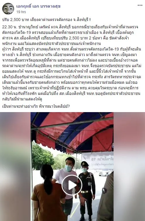 โดยคลิปดังกล่าวทาง เอกฤทธิ์ เอก บรรดาลสุข เผยไว้ว่า นาย ชำนาญวิทย์ เตรัตน์ ผวจ.สิงห์บุรี บอกกรณีชายเถียงกับเจ้าหน้าที่ด่านตรวจคัดกรองโควิด-19 ตรวจสอบแล้วเกิดที่ด่านตรวจขาเข้าเมือง จ.สิงห์บุรี เบื้องต้นถูกตำรวจ สภ.เมืองสิงห์บุรี เปรียบเทียบปรับ 2,500 บาท 2 ข้อหา คือ ขัดคำสั่งเจ้าพนักงาน และไม่แสดงบัตรประจำตัวประชาชนแก่เจ้าพนักงาน