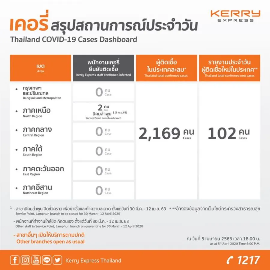 ในเพจเฟซบุ๊ค Kerry Express Thailand ได้โพสต์ข้อความระบุว่า เคอรี่ เน้นย้ำมาตรการเฝ้าระวังและเข้มงวดด้านความปลอดภัย จากกรณีที่มีพนักงานได้รับเชื้อcovid-19 และตรวจพบผู้ติดเชื้อเพิ่ม 1 คน ซึ่งเป็นเพื่อนที่ทำงานใกล้ชิดกับพนักงานคนแรกนั้น