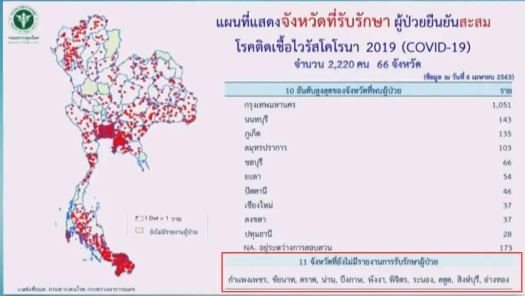 ในขณะที่ตัวเลขล่าสุดที่ทางศูนย์บริหารสถานการณ์โควิด19 นายแพทย์ทวีศิลป์ วิษณุโยธิน โฆษกกระทรวงสาธารณสุข และ โฆษกศูนย์บริหารสถานการณ์การแพร่ระบาดของโรคติดเชื้อไวรัสโคโรนา 2019 (โควิด-19) หรือ ศบค. ได้อัพเดตผู้ป่วยประจำวันที่ 6 เมษายน 2563 ว่า พบผู้ป่วยรายใหม่ 51 ราย กระจาย 66 จังหวัด รวมยอดสะสม 2,220 หายป่วยเพิ่ม 119 ราย รวมสะสม 793 เสียชีวิต 3 ราย รวมสะสม 26 ราย
