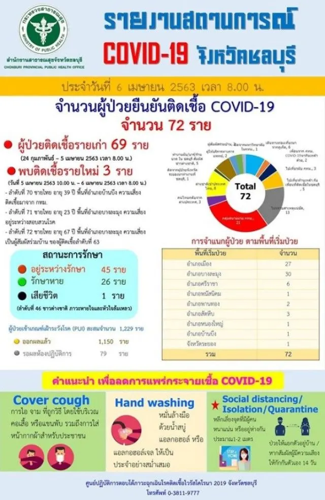 รายงานสถานการณ์ COVID 19 จังหวัดชลบุรี วันที่ 6 เมษายน 2563 เวลา 8จุด00 น ผู้ติดเชื้อสะสม 72 ราย เพิ่ม 3 ราย อยู่ระหว่างการรักษา 45 ราย รักษาหายแล้ว 26 ราย เสียชีวิต 1 ราย ลำดับที่ 46 ชาวต่างชาติ ภาวะหายใจและหัวใจล้มเหลว