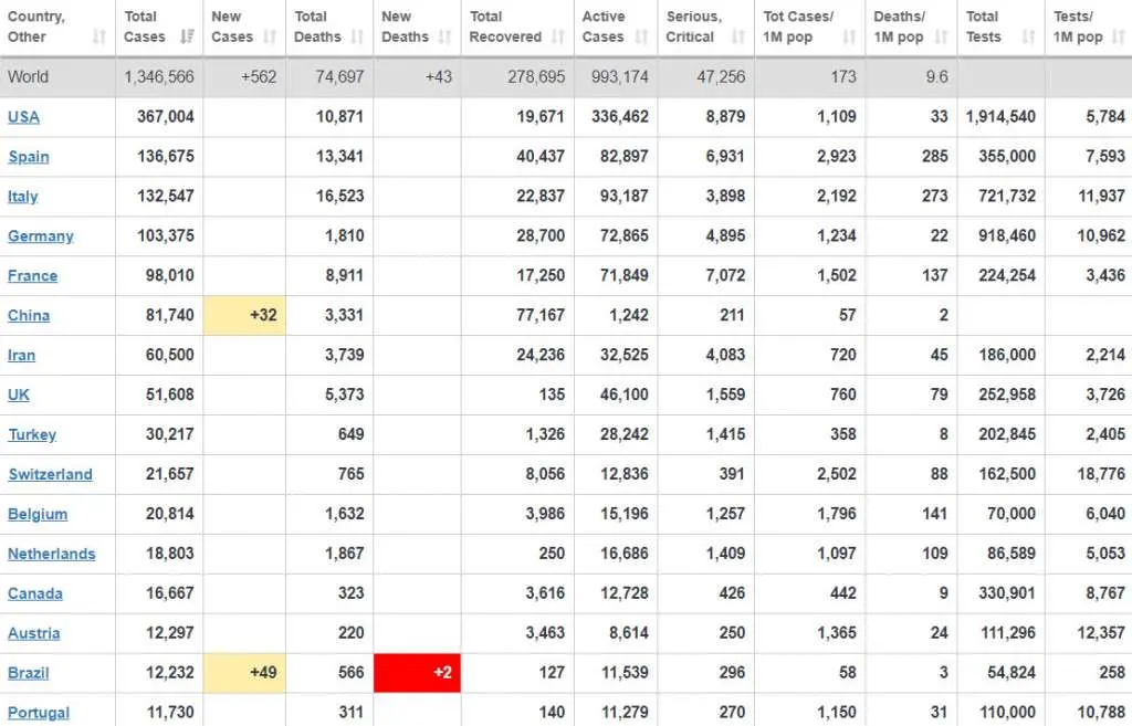 โดยสหรัฐอเมริกายังคงครองอันดับหนึ่งของโลกที่มียอดผู้ป่วยสะสมพุ่งไปถึง 367,004 ราย รองลงมาคือสเปนที่มียอดผู้ป่วยสะสมที่ 136,675 รายอันดับสามเป็นอิตาลีอยู่ที่ 132,547 ราย อันดับสี่เป็นเยอรมันที่ 103,375 ราย อันดับที่ห้าตกเป็นของฝรั่งเศสที่ 98,010 ราย อันดับที่หกเป็นจีนที่ 81,740 ราย อันดับเจ็ดเป็นอิหร่านมีผู้ป่วยสะสมอยู่ที่ 60,500 ราย อันดับที่แปดเป็นสหราชอาณาจักรที่ตัวเลข 51,608 ราย อันดับที่เก้าเป็นตุรกีที่ 30,217 ราย และอันดับสิบเป็นสวิตเซอร์แลนด์ที่ 21,657 ราย (ข้อมูล ณ วันที่ 7 เมษายน 2563 เวลา 08.40 น.)