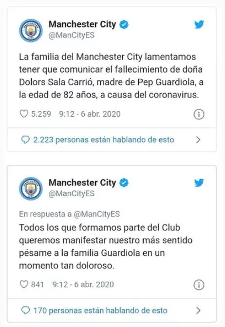 โดย ทวิตเตอร์ทางการของสโมสร แมนฯ ซิตี้ เปิดเผยข่าวร้ายนี้เมื่อช่วงบ่ายที่ผ่านมาตามเวลาท้องถิ่นว่า “ครอบครัว แมนเชสเตอร์ ซิตี้ ต่างโศกเศร้ากับรายงานข่าวการเสียชีวิตของคุณแม่ของ เป๊ป อย่าง โดลอร์ส ซาลา การ์ริโอ ใน มันเรซา, บาร์เซโลนา หลังติดเชื้อโคโรน่าไวรัส เธออายุ 82 ปี”