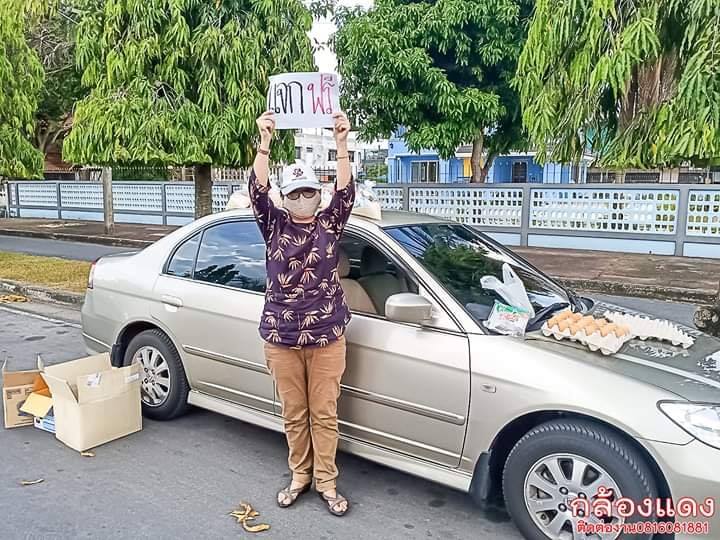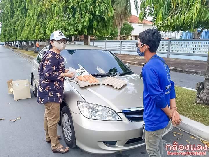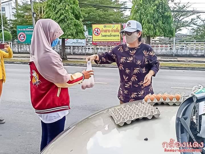 โดยเอาของที่เตรียมไว้ขึ้นรถส่วนตัว ขับรถออกไปมองหาจุดที่เหมะสมแล้วเตรียมตัวทำสิ่งที่บางคนนึกไม่ถึง ไม่มีใครที่ไม่ได้รับผลกระทบ แค่มากน้องต่างกันครับ ในเวลาเช่นนี้ พี่สาวคนนี้เลือกที่จะแบ่งปัน ดูในถุงที่วางอยู่บนหลังคารถ จะเห็นได้ว่าจะมีข้าวสาร ปลากระป๋อง บะหมี่กึ่งสำเร็จรูปและธนบัตร 50บาทบ้าง 100บาทบ้าง ไว้มอบให้กับผู้สูงอายุที่ผ่านไปมา ส่วนไข่ไก่พี่สาวก็มอบให้กับทุกท่านที่ประสงค์ที่จะต่อคิวรับ อย่าอายที่จะเป็นผู้รับน้ำใจพี่สาวในช่วงเวลาแบบนี้ แต่ถ้าวันนึงท่านพร้อมที่จะเป็นผู้ให้บ้าง อย่าลืมที่จะมอบน้ำใจเหล่านี้ให้กับผู้อื่นต่อต่อไป ยะลาเราก็จะน่าอยู่ยิ่งๆขึ้นครับ