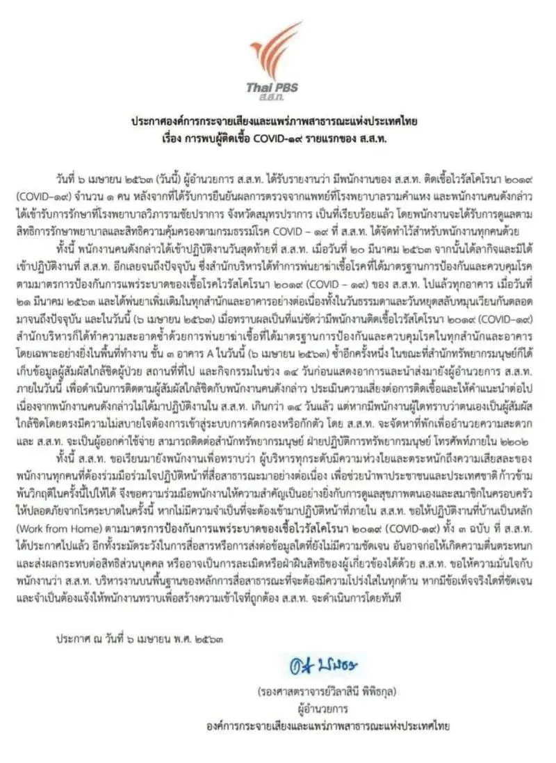 6 เมษายน 2563 ที่ผ่านมา รองศาสตราจารย์วิลาสินี พิพิธกุล ผู้อํานวยการองค์การกระจายเสียงและแพร่ภาพสาธารณะแห่งประเทศไทย (ThaiPBS) ได้ออกมาประกาศเรื่องพบพนักงานติดเชื้อโควิด-19 หลังจากที่่่ได้ยืนยันผลตรวจจากแพทย์ที่โรงพยาบาลรามคำแหง และพนักงานคนดังกล่าวได้เข้ารับการรักษาที่โรงพยาบาลวิภารามชัยปราการ จ.สมุทรปราการ แล้ว