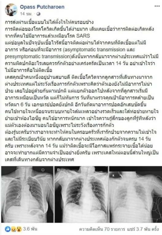 วันที่ 6 เมษายน 63 ผศ.นพ.(พิเศษ)โอภาส พุทธเจริญ หัวหน้าศูนย์ความเป็นเลิศทางการแพทย์ โรคอุบัติใหม่ด้านคลินิก รพ.จุฬาลงกรณ์ ได้โพสต์ข้อความเกี่ยวกับการแพร่ระบาดของเชื้อโควิด-19 เรื่องราวช็อกผ่านเฟสบุ๊ค Opass Putcharoen กรณีลูกกลับจากต่าประเทศไม่กักตัว ทำแม่ติดโควิดอาการหนักว่า