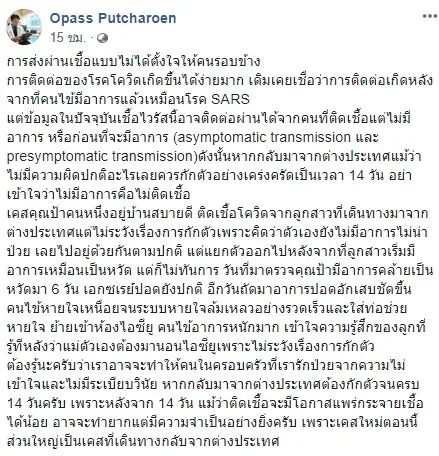 เมื่อวันที่ 6 เมษายน 2563 นพ.โอภาส พุทธเจริญ จากหน่วยโรคติดเชื้อ ภาควิชาอายุรศาสตร์ คณะแพทยศาสตร์ จุฬาลงกรณ์มหาวิทยาลัย ได้มีการโพสต์รูปภาพผ่านเฟซบุ๊ก Opass Putcharoen พร้อมทั้งระบุข้อความว่า…