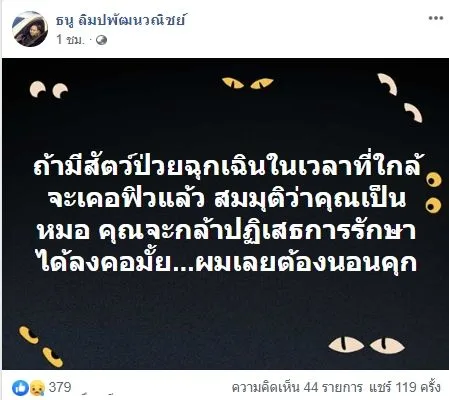 โดยบนเฟซบุ๊กหมอบอยได้โพสต์ว่า “ถ้ามีสัตว์ป่วยฉุกเฉินในเวลาที่ใกล้จะเคอร์ฟิวแล้ว สมมุติว่าคุณเป็นหมอ คุณจะกล้าปฏิเสธการรักษาได้ลงคอมั้ย…ผมเลยต้องนอนคุก”