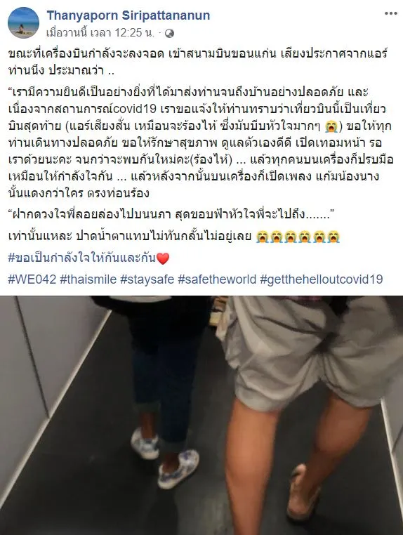 “เรามีความยินดีเป็นอย่างยิ่งที่ได้มาส่งท่านจนถึงบ้านอย่างปลอดภัย และเนื่องจากสถานการณ์covid19 เราขอแจ้งให้ท่านทราบว่าเที่ยวบินนี้เป็นเที่ยวบินสุดท้าย (แอร์เสียงสั่น เหมือนจะร้องไห้ ซึ่งมันบีบหัวใจมากๆ ) ขอให้ทุกท่านเดินทางปลอดภัย ขอให้รักษาสุขภาพ ดูแลตัวเองดีดี เปิดเทอมหน้า รอเราด้วยนะคะ จนกว่าจะพบกันใหม่ค่ะ(ร้องไห้) … แล้วทุกคนบนเครื่องก็ปรบมือเหมือนให้กำลังใจกัน … แล้วหลังจากนั้นบนเครื่องก็เปิดเพลง แก้มน้องนางนั้นแดงกว่าใคร ตรงท่อนร้อง