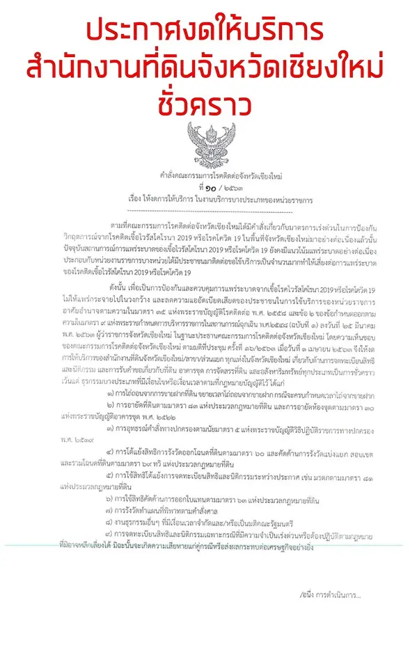 เชียงใหม่ ประกาศ สนง.ประกันสังคม สนง.ที่ดิน งดให้บริการชั่วคราว
