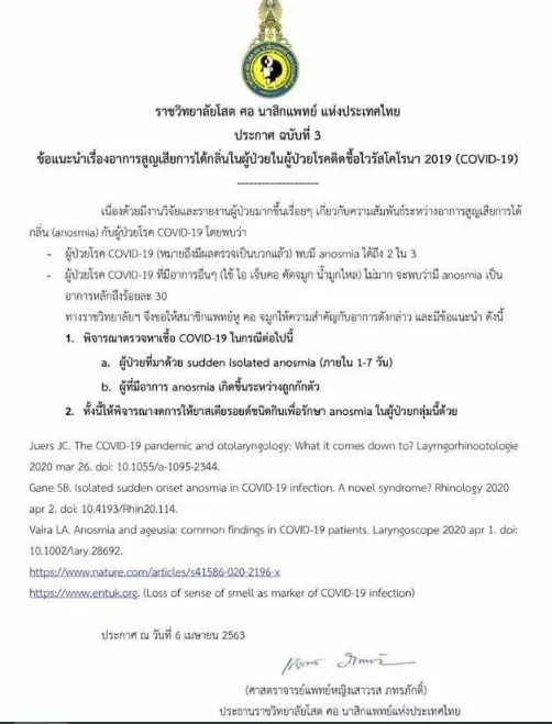 โดยเมื่อวันที่ 6 เม ย 63 ที่ผ่านมา ศ พญ เสาวรส ภทรภักดิ์ ประธานราชวิทยาลัยโสต ศอ นาสิกแพทย์แห่งประเทศไทย ได้ออกประกาศราชวิทยาลัยโสต ศอ นาสิกแพทย์ แห่งประเทศไทย เรื่อง ข้อแนะนำเรื่องอาการสูญเสียการได้กลิ่น ในผู้ป่วยโรคติดเชื้อไวรัสโคโรน่า 2019 ระบุว่า