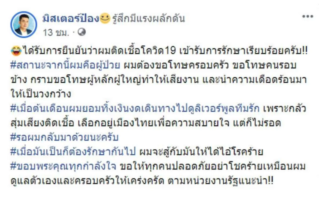 “ได้รับการยืนยันว่าผมติดเชื้อโควิด-19 เข้ารับการรักษาเรียบร้อยแล้ว สถานะของตนในตอนนี้คือผู้ป่วย ซึ่งต้องขอโทษครอบครัว ขอโทษคนรอบข้าง กราบขอโทษผู้หลักผู้ใหญ่ทำให้เสียงาน และนำความเดือดร้อนมาให้เป็นวงกว้าง ทั้งนี้เมื่อต้นเดือน ยอมทิ้งเงินงดเดินทางไปดูลิเวอร์พูลทีมรัก เพราะกลัวสุ่มเสียงติดเชื้อ เลือกอยู่เมืองไทยเพื่อความสบายใจ แต่ก็ไม่รอด พร้อมขอบคุณทุกกำลังใจ ขอให้ทุกคนปลอดภัย ดูแลตัวเองและครอบครัวอย่างเคร่งครัดตามหน่วยงานรัฐแนะนำ”