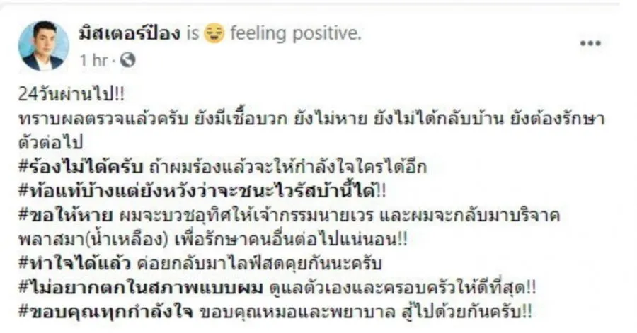 ทั้งนี้ล่าสุด “ มิสเตอร์ป๋อง” ได้ออกมาอัพเดตอาการป่วยผ่านทางเฟซบุ๊ก ระบุว่า “24 วันผ่านไปทราบผลตรวจแล้วยังมีเชื้อบวกยังไม่หายยังไม่ได้กลับบ้านยังต้องรักษาตัวต่อไปและหากหายแล้วก็จะบวกให้เจ้ากรรมนายเวรรวมถึงบริจาคพลาสมาเพื่อช่วยเหลือผู้ป่วยรายอื่นต่อไป”