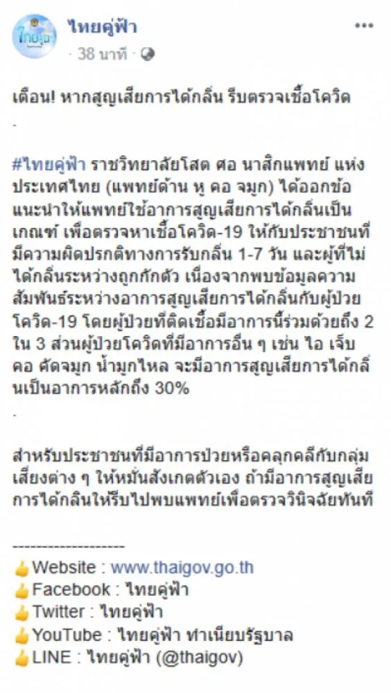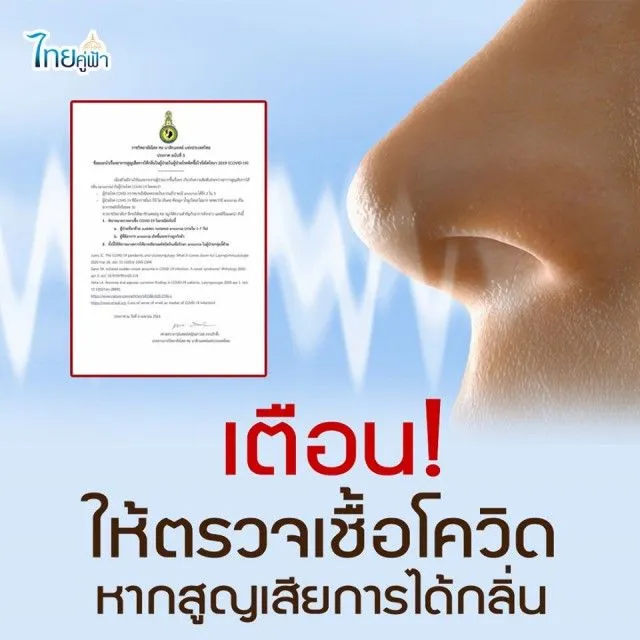 เมื่อวันที่ 7 เมษายน เพจ ไทยคู่ฟ้าโพสต์ข้อความระบุว่า เตือน หากสูญเสียการได้กลิ่น รีบตรวจหา CO VID ไทยคู่ฟ้า ราชวิทลัยโสต ศอ นาสิกแพทย์ แห่งประเทศไทย แพทย์เฉพาะทาง ได้ออกข้อแนะนำให้แพทย์ใช้อาการสูญเสียการได้กลิ่นเป็นเกณฑ์ เพื่อตรวจหา CO VID ให้กับประชาชนที่มีความผิดปรกติทางการรับกลิ่น 1ถึง7 วัน