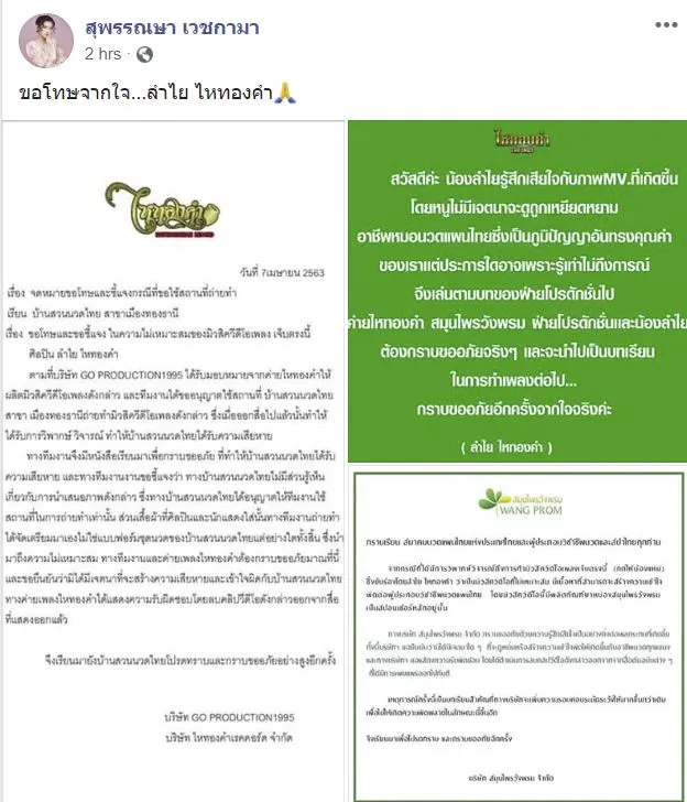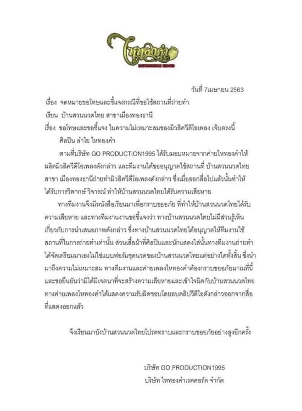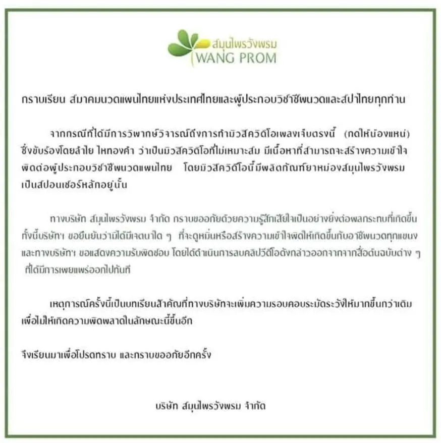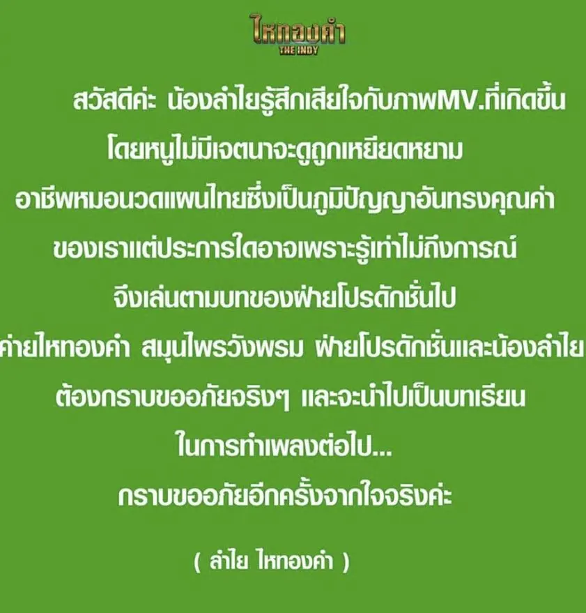 สวัสดีค่ะ น้องลำไยรู้สึกเสียใจกับภาพMV ที่เกิดขึ้น หนูไม่มีเจตนาจะดูถูกเหยียดหยามอาชีพหมอนวดเเผนไทยซึ่งเป็นภูมิปัญญาอันทรงคุณค่าของเราเเต่ประการใด อาจะเพราะรู้เท่าไม่ถึงการณ์ จึงเล่นตามบทของฝ่ายโปรดัคชั่นไป ค่ายไหทองคำ สมุนไพรวังพรม ฝ่ายโปรดัคชั่นเเละน้องลำไย ต้องกราบขออภัยจริงๆ จะนำไปเป็นบทเรียนในการทำเพลงต่อไป การขออภัยอีกครั้งจากใจจริงค่ะ ตามมาด้วยจดหมายขอโทษเเละชี้เเจงกรณีขอใช้สถานที่ถ่ายทำ ของบริษัทโปรดัคชั่นเเละ บริษัทไหทองคำเรคคอร์ด