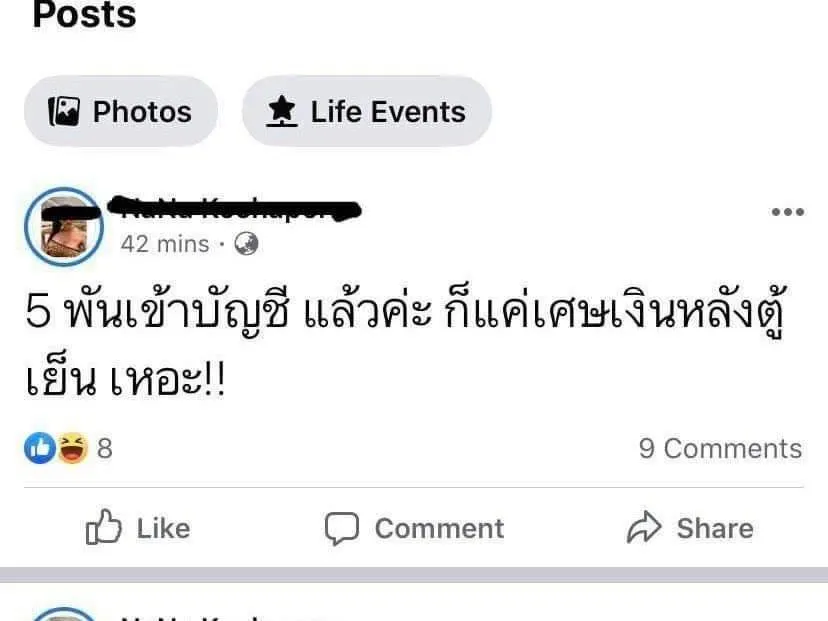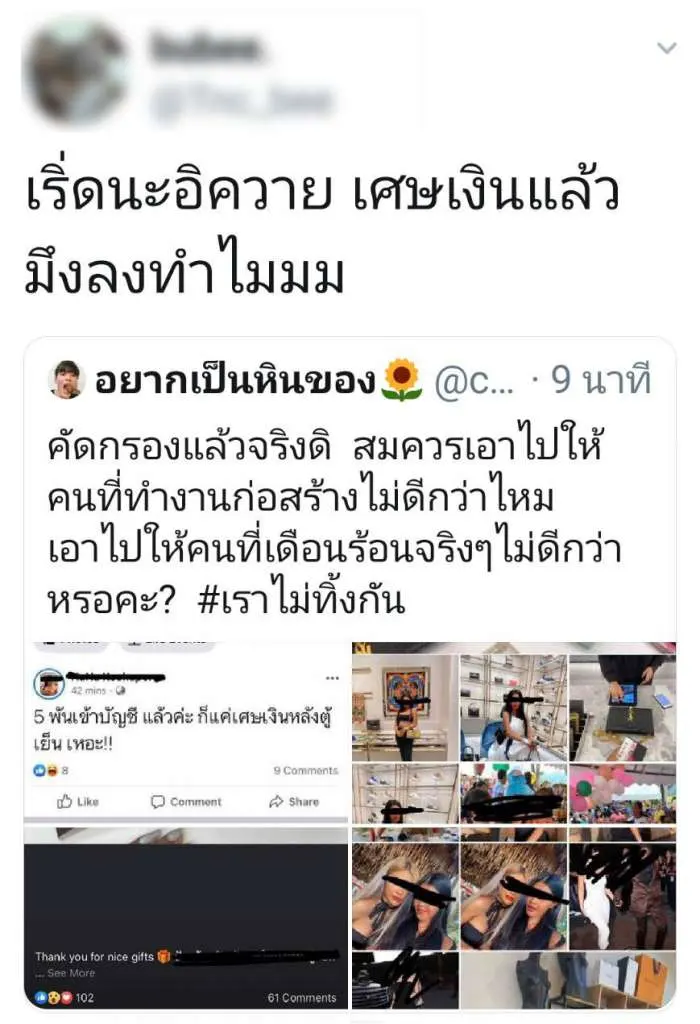 แต่กลับมีหญิงสาวผู้ใช้เฟซบุ๊กรายหนึ่งซึ่งคาดว่าเธอเป็นเจ้าของร้านเสื้อผ้า โพสต์ข้อความแจ้งว่าเธอได้รับเงิน 5,000 บาทแล้ว แต่สิ่งที่ทำให้ชาวเน็ตเข้าไปถล่มเธออย่างหนักหน่วงคือข้อความที่เธอโพสต์นั้น บอกว่า 5 พันบาทก็แค่เศษเงิน ซึ่งหญิงสาวคนนี้เขียนข้อความระบุว่า “5 พันเข้าบัญชีแล้วค่ะ ก็แค่เศษเงินหลังตู้เย็น เหอะ!!” งานนี้ทำเอาทัวร์ลงจนสาวรายนี้ต้องรีบลบโพสต์ดังกล่าวออกไปแทบไม่ทัน