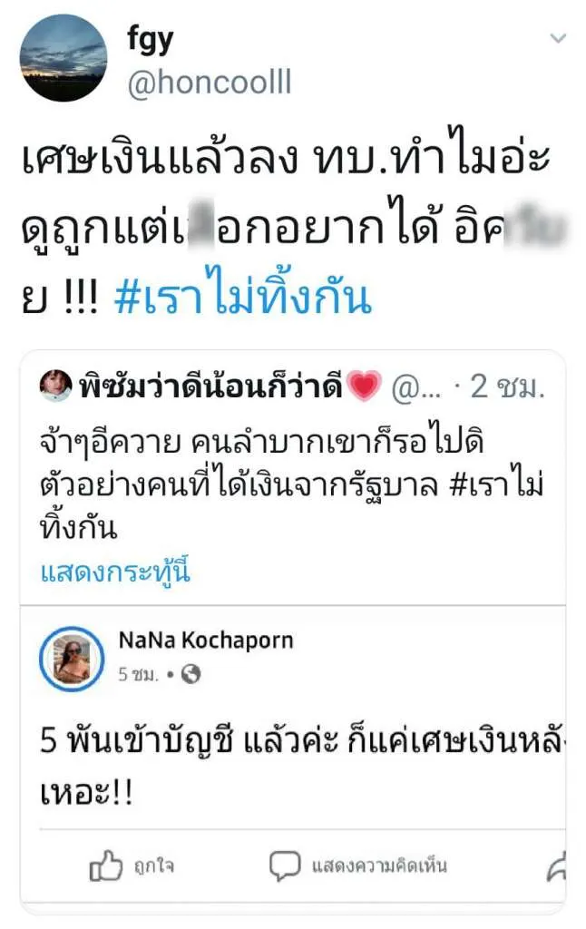 กลายเป็นประเด็นดราม่าร้อนฉ่าในโลกออนไลน์ หลังจากที่เมื่อช่วงกลางดึกที่ผ่านมา รัฐบาลเริ่มที่จะทยอยโอนเงินมาตรการเยียวยา 5,000 บาท (3 เดือน) ที่เปิดให้ลงทะเบียนผ่านเว็บไซต์ www.เราไม่ทิ้งกัน.com ตั้งแต่เมื่อวันที่ 28 มีนาคม 2563 ที่ผ่านมา ให้กับ ปชช. ไปบ้างแล้ว