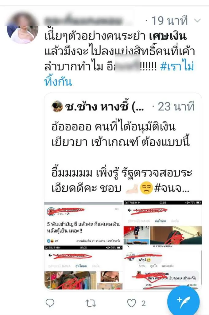 และเมื่อเข้าไปส่งเฟซบุ๊กส่วนตัวของเธอนั้น พบว่า เธอใช้ของแบรนด์เนม กระเป๋า นาฬิกา และแต่งตัวดีมาก ๆ ค่อนข้างมีฐานะเลยก็ว่าได้ ซึ่งย้อนแย้งกับโครงการเยียวยาดังกล่าวอย่างสิ้นเชิง ทำเอาโลกออนไลน์ตั้งคำถามว่ารัฐบาลตรวจสอบข้อมูลผู้ที่มีสิทธิได้รับเงินมาตรการเยียวยา 5,000 บาท อย่างละเอียดแล้วจริงๆ หรือว่า เป็นการสุ่มแจก และคนที่เดือดร้อนจริงๆ กลับไม่มีสิทธิที่จะได้รับเงินช่วยเหลือนี้ ทำให้ ณ ขณะนี้ #เราไม่ทิ้งกัน ขึ้นมาติดเทรนด์ทวิตเตอร์อันดับ 1 และถูกพูดถึงกันอย่างมาก