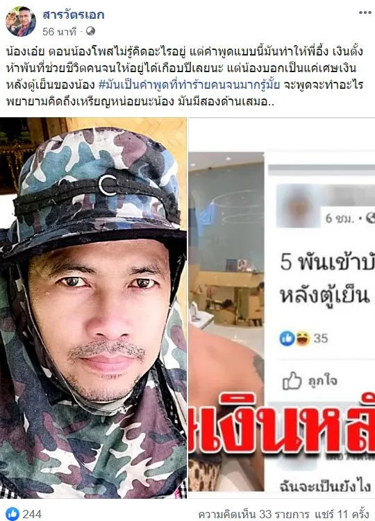 ล่าสุดพ.ต.ท.เอกราช หุ่นงาม รอง ผกก.สส.สภ.บางสะพานน้อย จังหวัดประจวบคีรีขันธ์ ได้โพสต์แสดงความคิดเห็นเกี่ยวกับเรื่องดังกล่าวว่า “น้องเอ๋ย ตอนน้องโพสต์ไม่รู้คิดอะไรอยู่ แต่คำพูดแบบนี้มันทำให้พี่อึ้ง เงินตั้งห้าพันที่ช่วยชีวิตคนจนให้อยู่ได้เกือบปีเลยนะ แต่น้องบอกเป็นแค่เศษเงินหลังตู้เย็นของน้อง #มันเป็นคำพูดที่ทำร้ายคนจนมากรู้มั้ย จะพูดจะทำอะไรพยายามคิดถึงเหรียญหน่อยนะน้อง มันมีสองด้านเสมอ..” ทำให้ชาวเน็ตเข้ามาแสดงความคิดเห็นเป็นจำนวนมาก