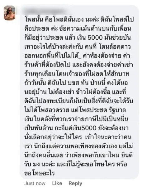 และที่ดิฉันไปลงทะเบียนก็มันเป็นสิ่งที่ดิฉันจะได้รับไม่ได้โพสต์อวดรวย แต่โพสต์ประชด รัฐบาลเงินในคลังที่พวกเราจ่ายภาษีไปมีเป็นหมื่น เป็นพันล้าน กะอีแค่เงิน 5000 ยังจะต้องมา นั่งเลือกอยู่ว่าจะให้ใคร เข้าใจนะคะว่าคนเรา นึกถึงแต่ความพอเพียงของตัวเอง แต่ไม่