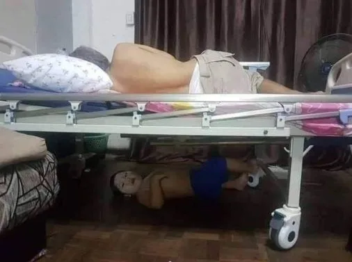 ผู้ใช้เฟซบุ๊กรายหนึ่งได้โพสต์ภาพพร้อมระบุข้อความว่า พยาบาลเข้ามาตรวจคนไข้แทบช็อก คุณตาป่วย หลานมาเฝ้าไข้ จะภาพจะเห็นว่า หนูน้อยลงไปนอนใต้เตียงคุณตา อาบน้ำทาแป้ง นอนเล่นอย่างสบายใจ แต่ภาพที่พยาบาลเข้ามาเห็นนั้น ทำให้ไม่ค่อยสบายใจเท่าไหร่