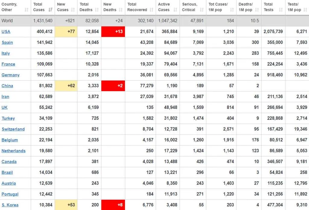 โดยสหรัฐอเมริกายังคงครองอันดับหนึ่งของโลกที่มียอดผู้ป่วยสะสมพุ่งไปถึง 400,412 ราย รองลงมาคือสเปนที่มียอดผู้ป่วยสะสมที่ 141,942 รายอันดับสามเป็นอิตาลีอยู่ที่ 135,586 ราย อันดับสี่เป็นฝรั่งเศสที่ 109,069 ราย อันดับที่ห้าตกเป็นของเยอรมันที่ 107,663 ราย อันดับที่หกเป็นจีนที่ 81,802 ราย อันดับเจ็ดเป็นอิหร่านมีผู้ป่วยสะสมอยู่ที่ 62,589 ราย อันดับที่แปดเป็นสหราชอาณาจักรที่ตัวเลข 55,242 ราย อันดับที่เก้าเป็นตุรกีที่ 34,109 ราย และอันดับสิบเป็นสวิตเซอร์แลนด์ที่ 22,253 ราย (ข้อมูล ณ วันที่ 8 เมษายน 2563 เวลา 09.00 น.)