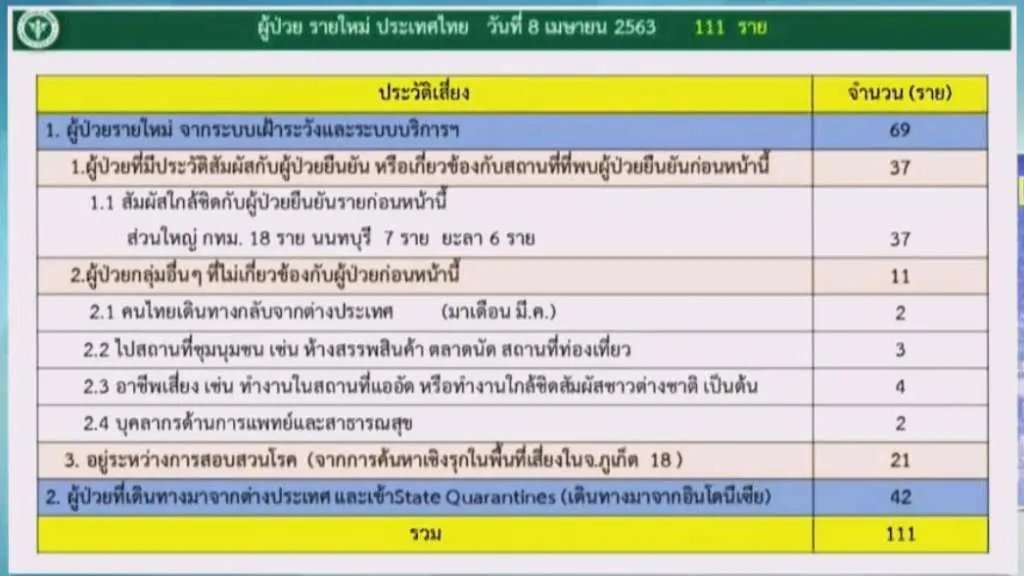 รายละเอียดผู้ป่วยรายใหม่ในประเทศไทย ประจำวันที่ 8 มษายน 2563 ทั้งสิ้น 111 รายมีดังนี้