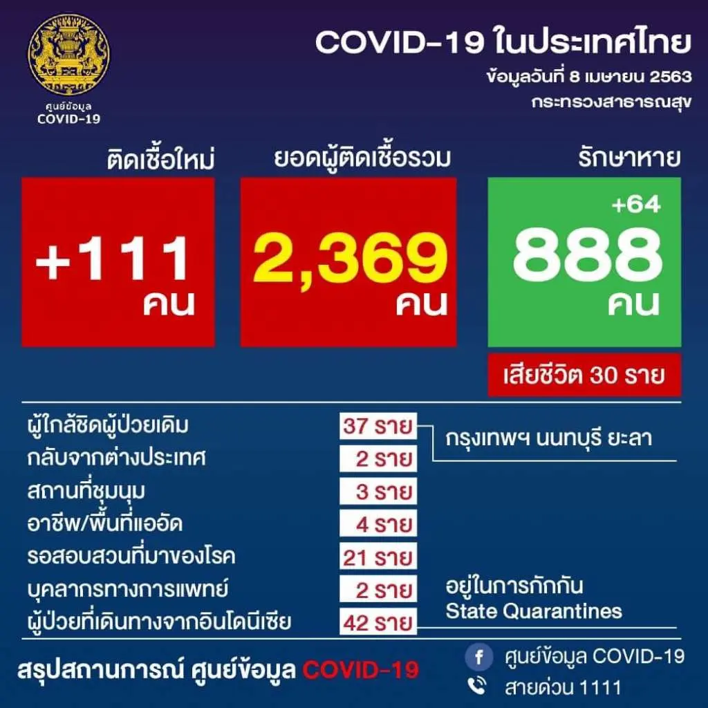 ล่าสุด ศูนย์บริหารสถานการณ์โควิด19 นายแพทย์ทวีศิลป์ วิษณุโยธิน โฆษกกระทรวงสาธารณสุข และ โฆษกศูนย์บริหารสถานการณ์การแพร่ระบาดของโรคติดเชื้อไวรัสโคโรนา 2019 (โควิด-19) หรือ ศบค. ได้อัพเดตผู้ป่วยประจำวันที่ 8 เมษายน 2563 เวลา 11.30 น. ว่า พบผู้ติดเชื้อรายใหม่ 111 ราย โดยยอดสะสมอยู่ที่ 2,369 ราย หายป่วยสะสม 888 ราย ขณะเดียวกันมีผู้เสียชีวิตเพิ่ม 3 ราย ส่งผลให้ยอดผู้ติดเชื้อสะสมเพิ่มเป็น 30 ราย
