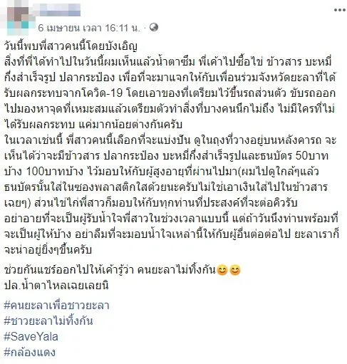 อย่าอายที่จะเป็นผู้รับน้ำใจพี่สาวในช่วงเวลาแบบนี้ แต่ถ้าวันนึงท่านพร้อมที่จะเป็นผู้ให้บ้าง อย่าลืมที่จะมอบน้ำใจเหล่านี้ให้กับผู้อื่นต่อต่อไป ยะลาเราก็จะน่าอยู่ยิ่งๆขึ้นครับ